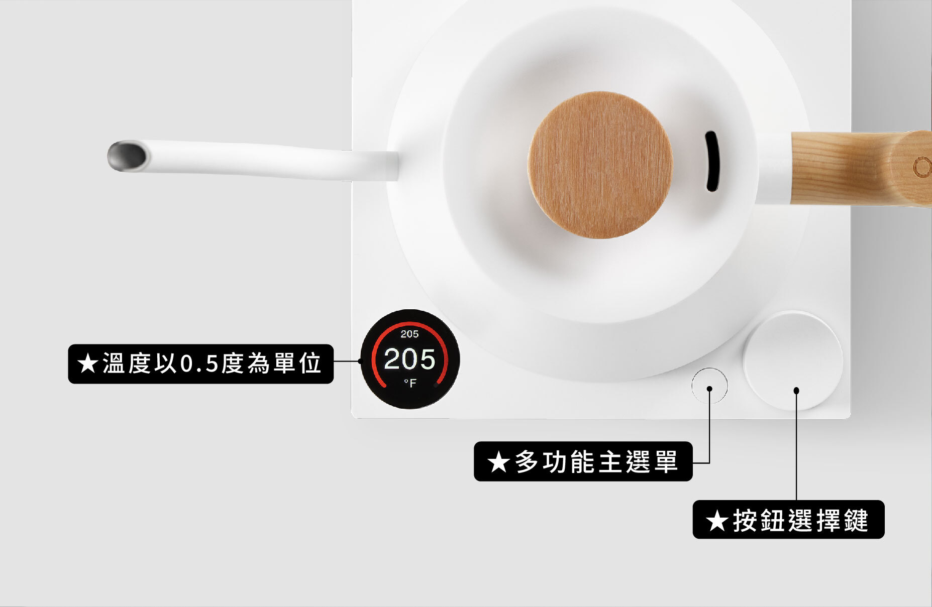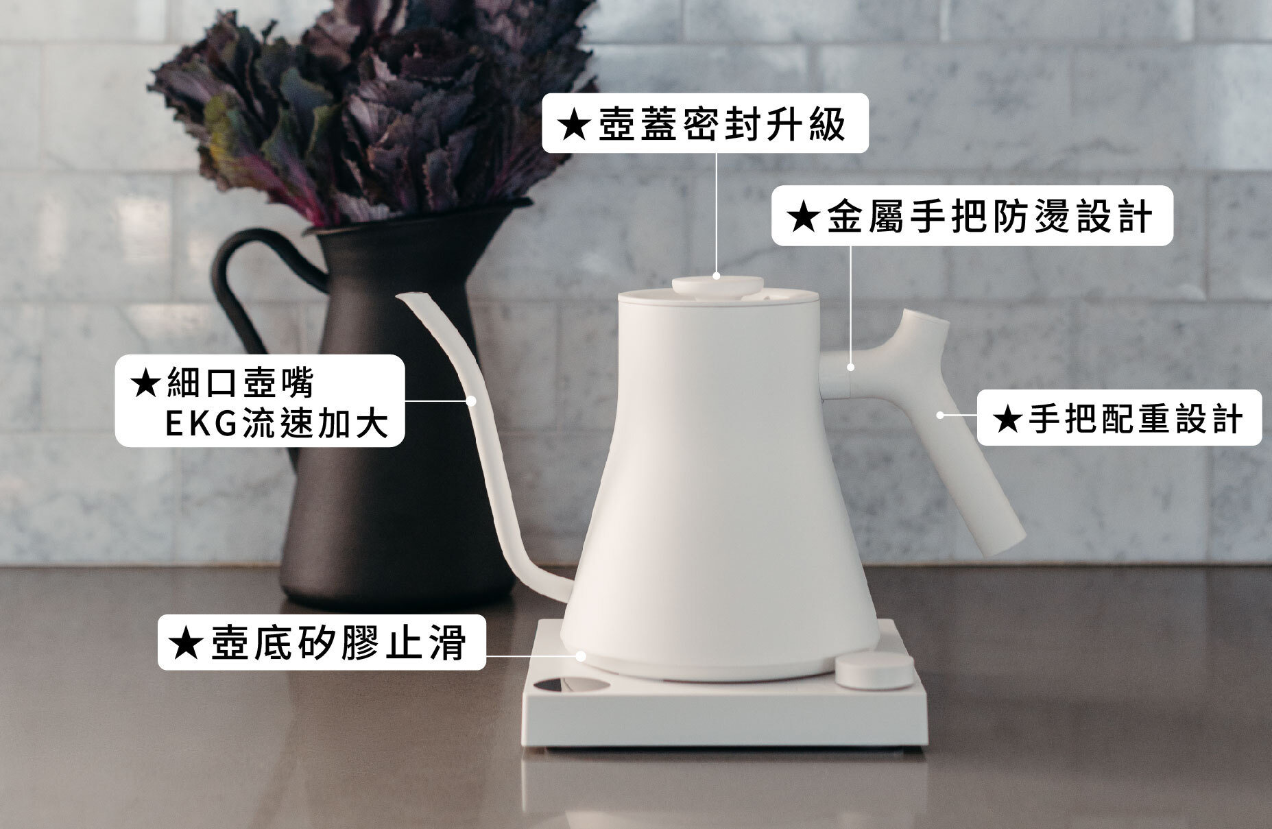 大面積留白搭配線條與產品示意圖,讓人一眼就能辨識壺身的俐落曲線。