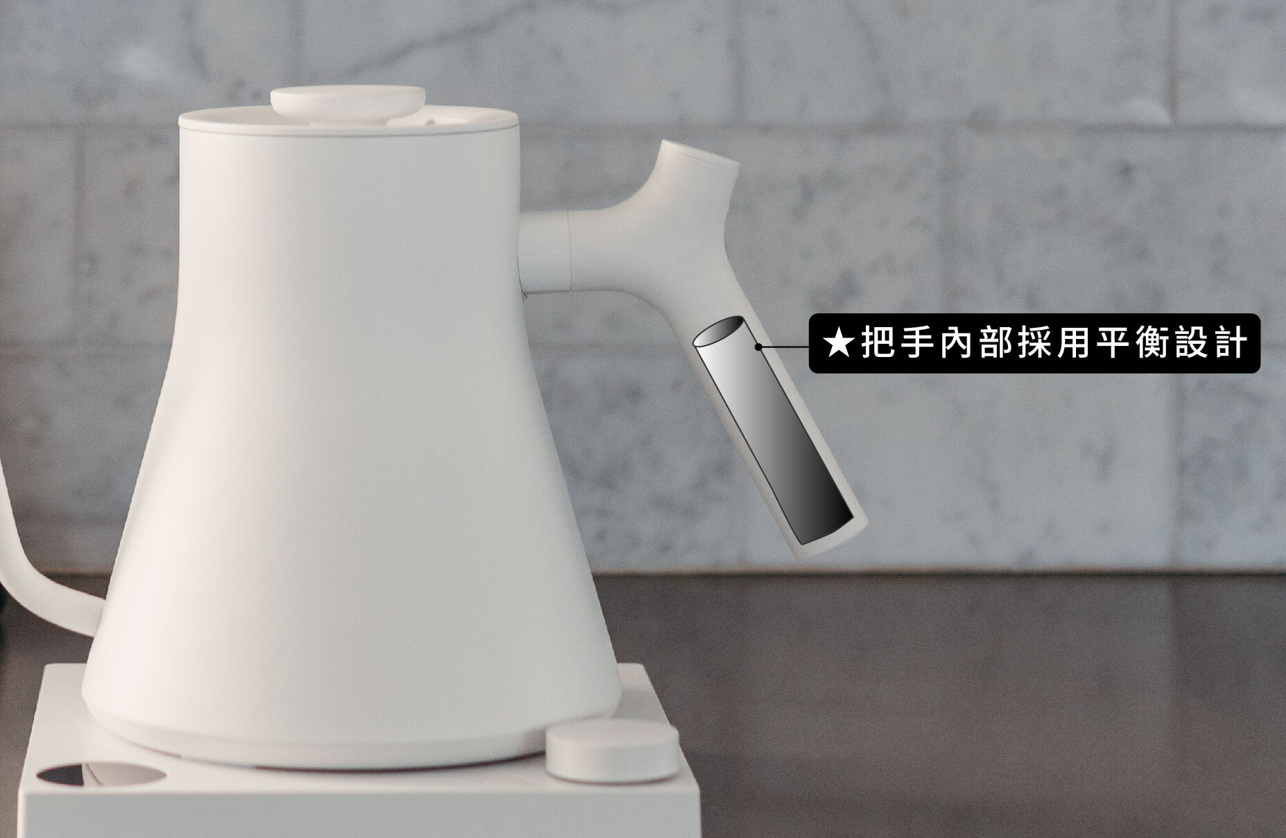 手把內部特別配置配重,讓重心更靠近手腕。這樣的設計能在注水時提供更佳的控制感與穩定性,無論是少量細流還是連續注水,都能輕鬆掌握。