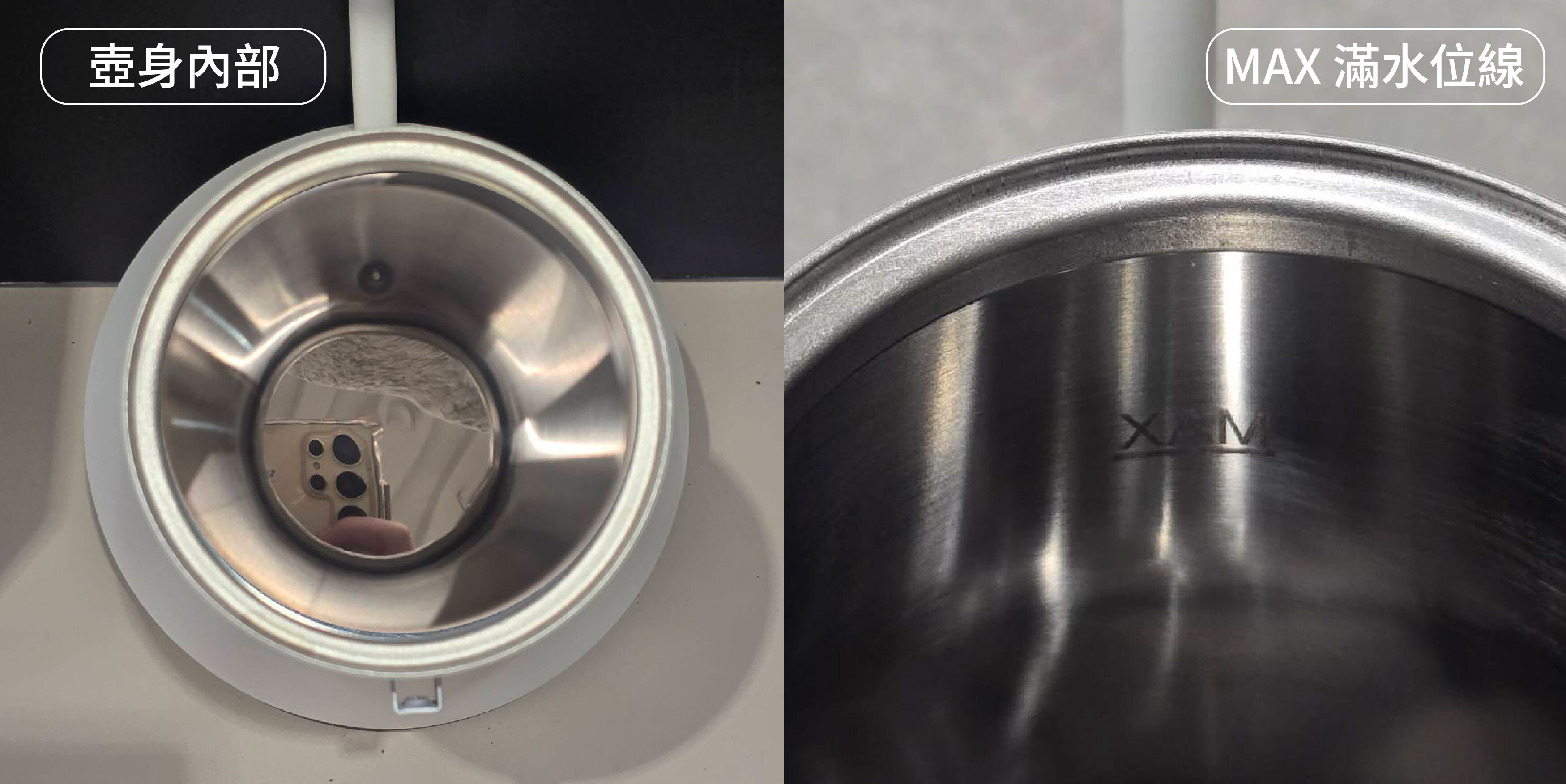 ◎ 壺身內部為 304 不鏽鋼,內有 MAX 滿水位線