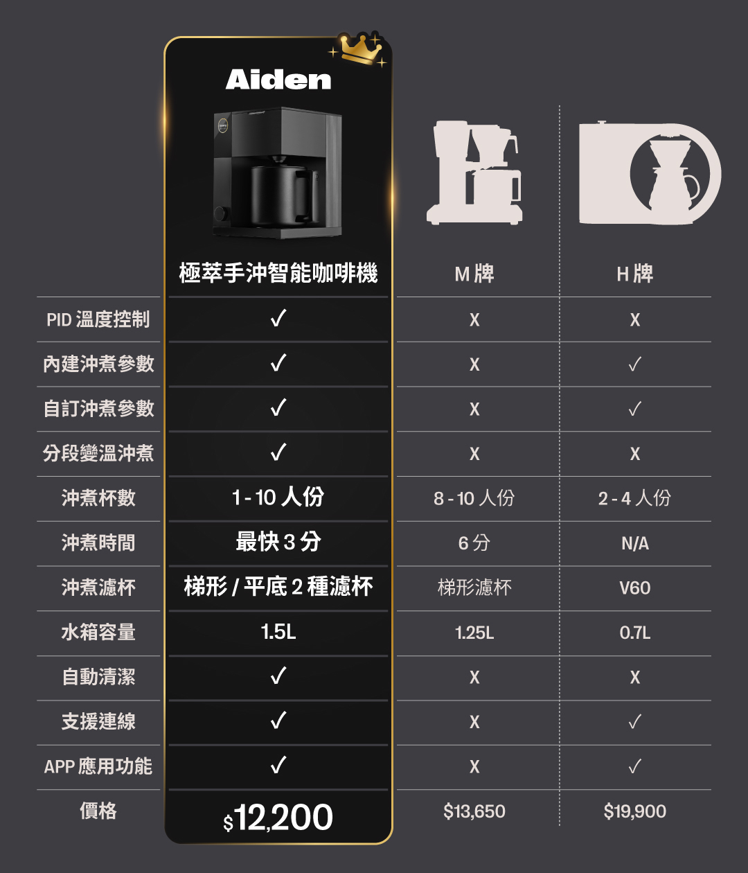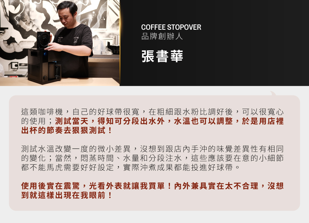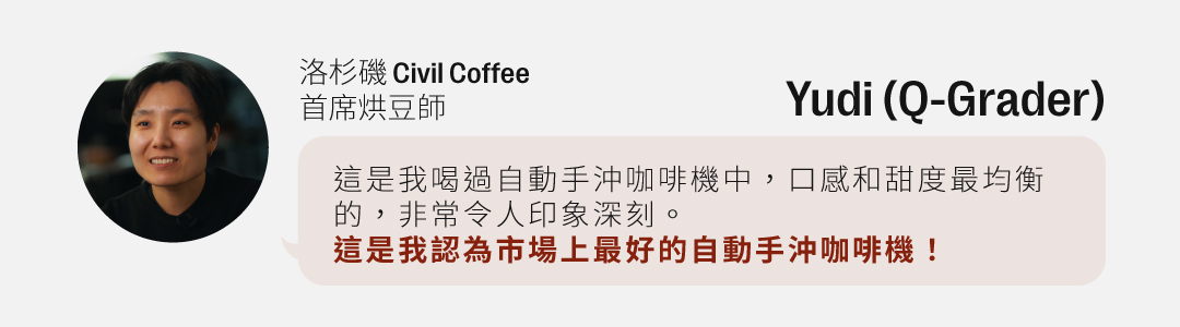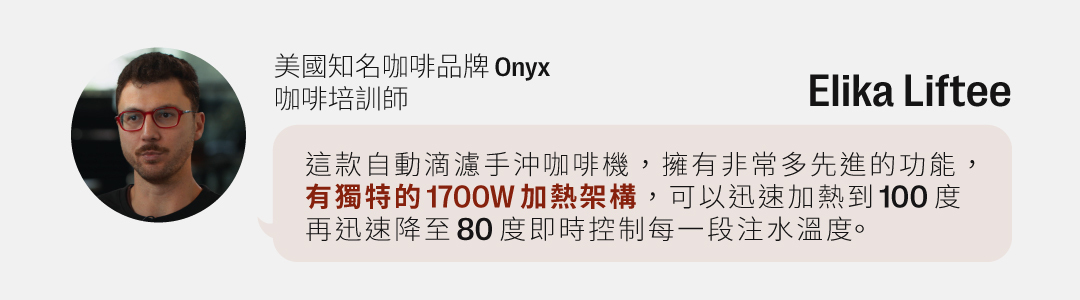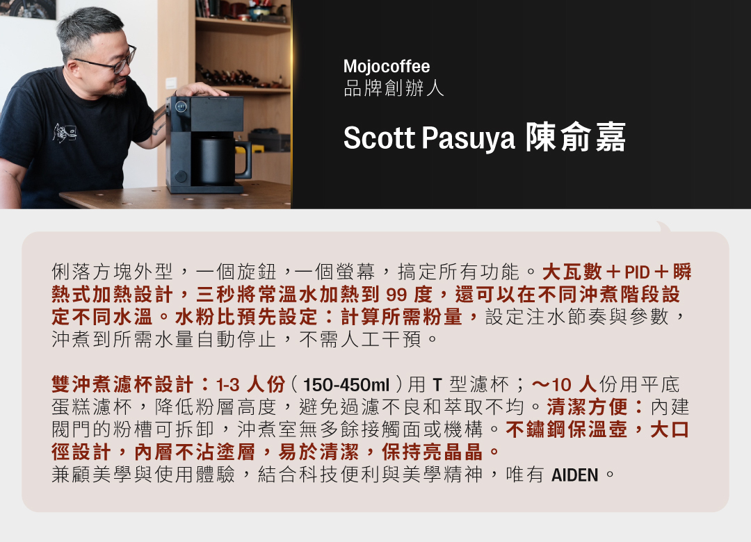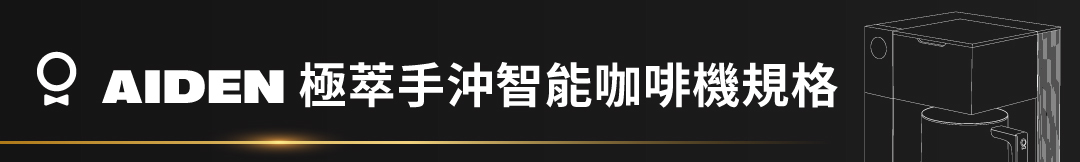 「目前為止市面上還沒有任何一台手沖咖啡機能在單杯沖煮時完整的萃取當代淺焙精品咖啡!AIDEN 不管是單杯到十杯都能沖煮出超乎水準的精品咖啡!」