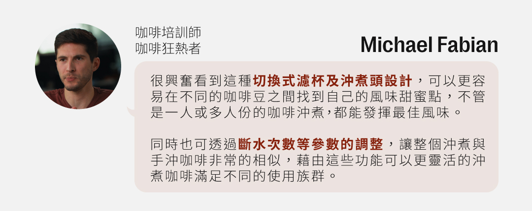 透過兩段全方位花灑式沖煮頭及兩種沖煮濾杯的搭配實現一到十杯的沖煮彈性。
