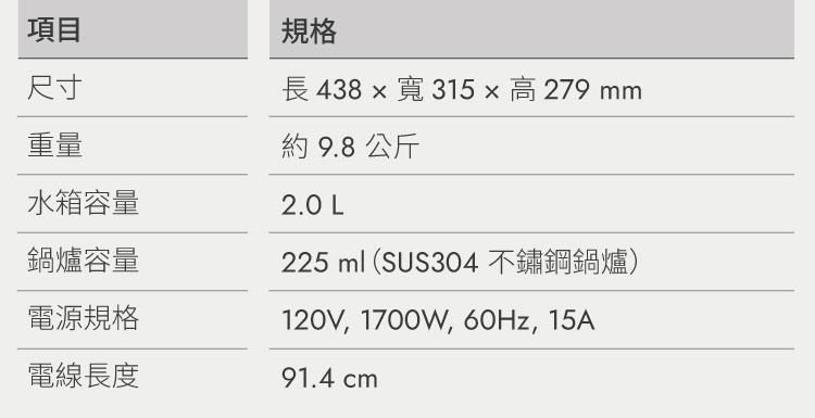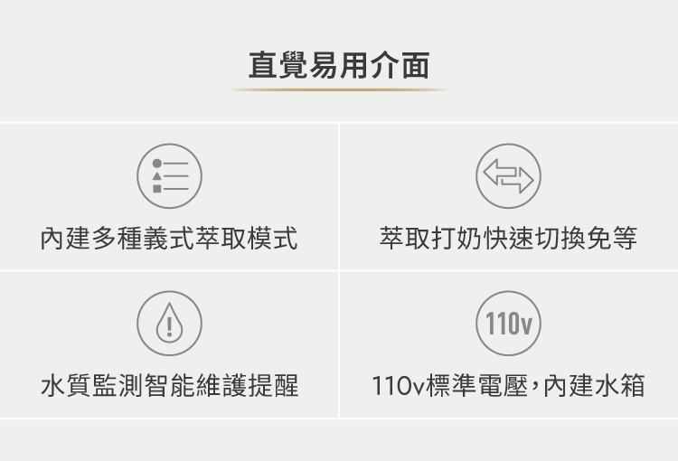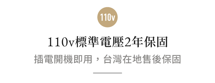 使用台灣 110v 標準電壓,無需更動電力配置:內建 2 公升大容量水箱及低水量提示,水箱採機頂可抽取式設計,缺水更便利補給,也無需外接水源。