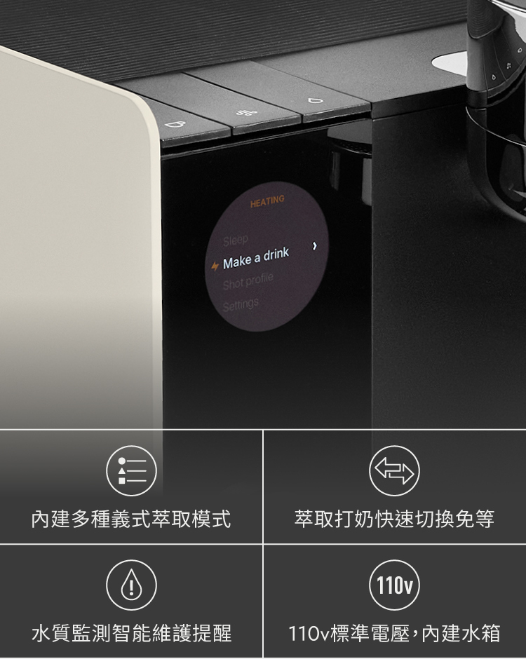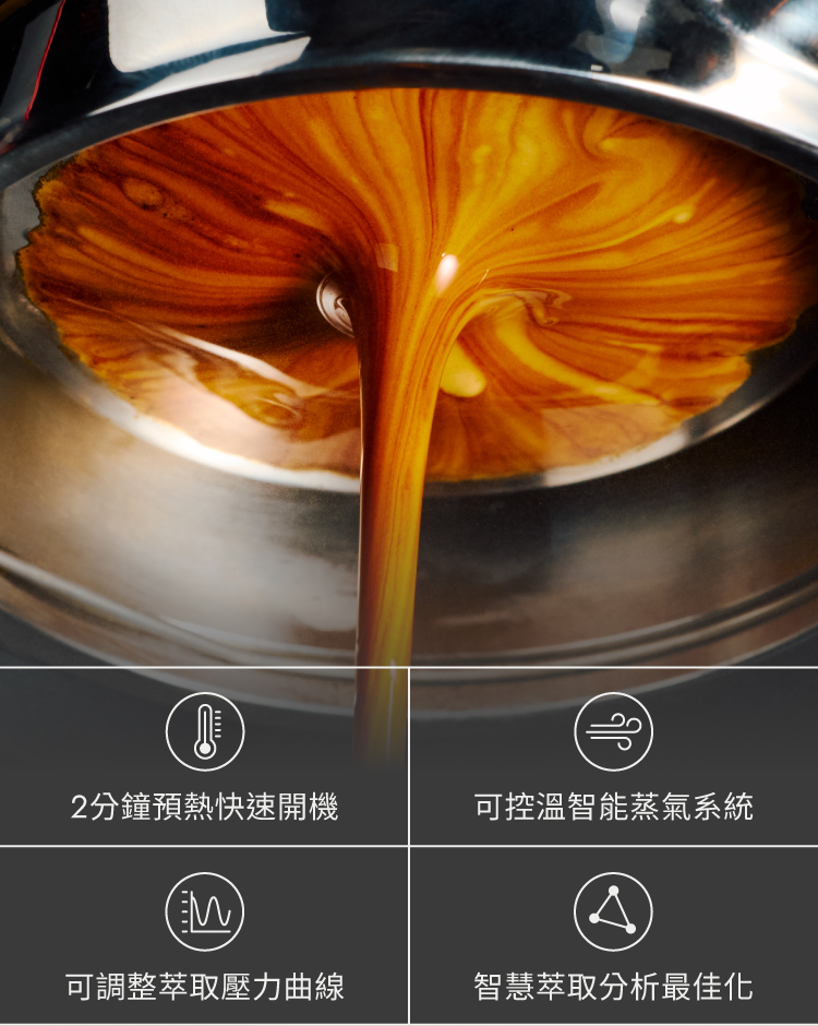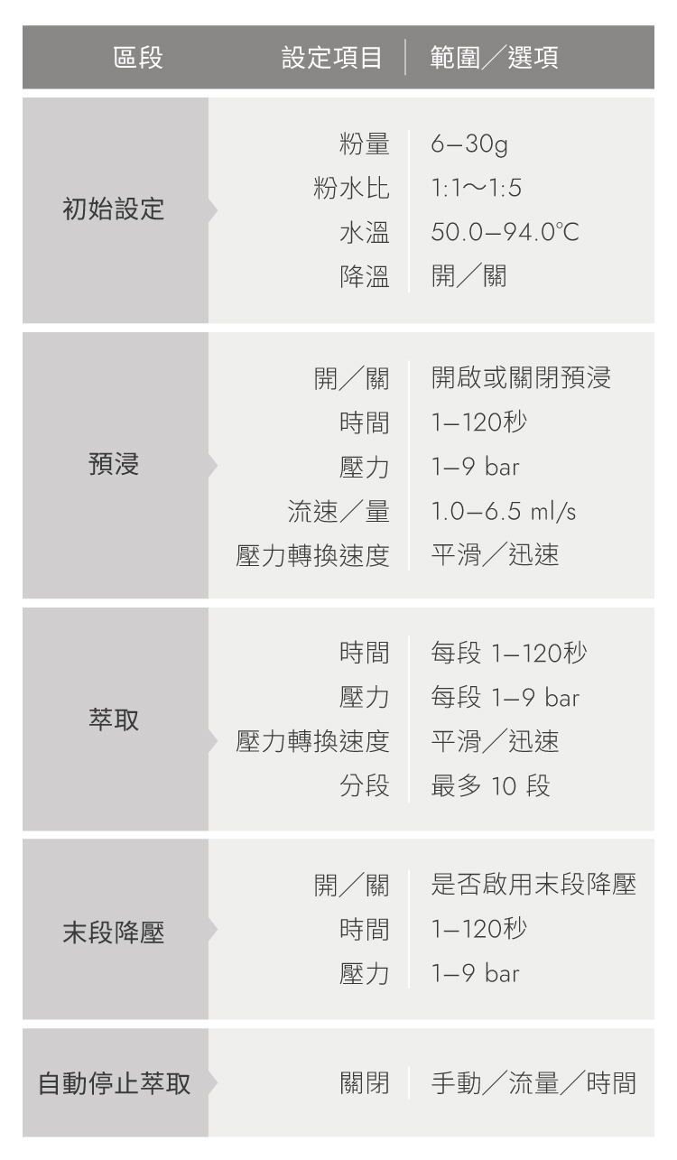 支援完整萃取壓力曲線控制,從預浸、萃取到降壓,每個階段壓力都能自行設定,義式咖啡進階功能完整支援。