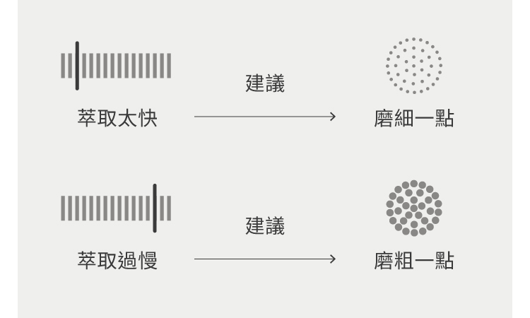 ★ 萃取太快 - 水流通過咖啡粉的速度太快,來不及把咖啡粉中美好的風味物質溶解出來。建議磨細一點。