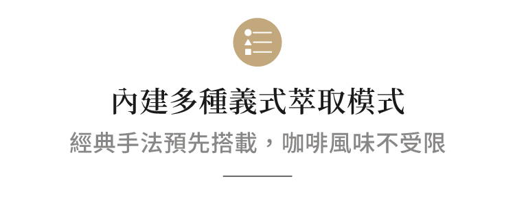 預先搭載數組經典義式咖啡萃取手法,透過內部多組感測器,實現各種高階義式咖啡機萃取流程,讓義式不再是只有固定一個壓力可以萃取咖啡,讓您探索精品咖啡的各種風味可能。